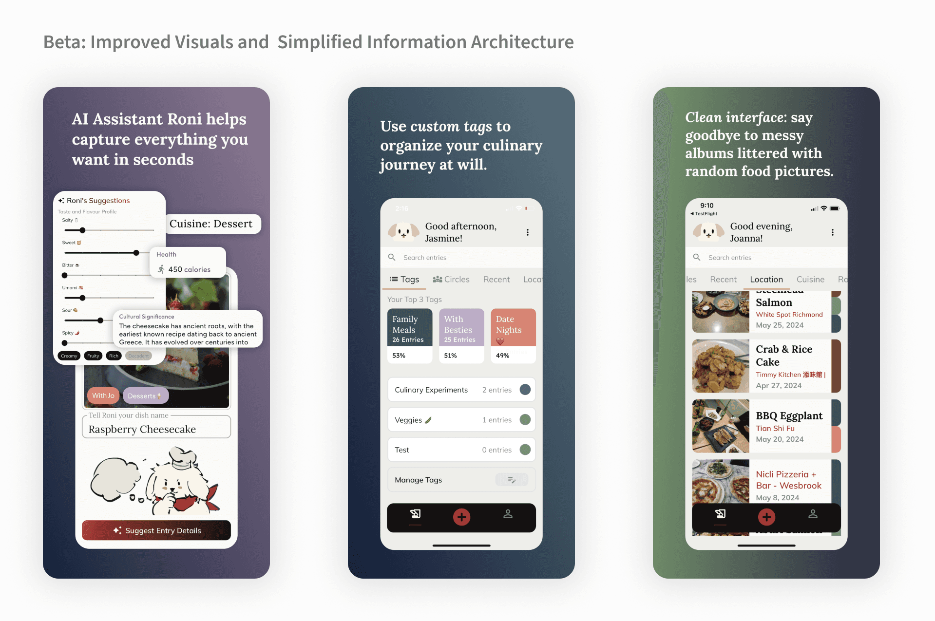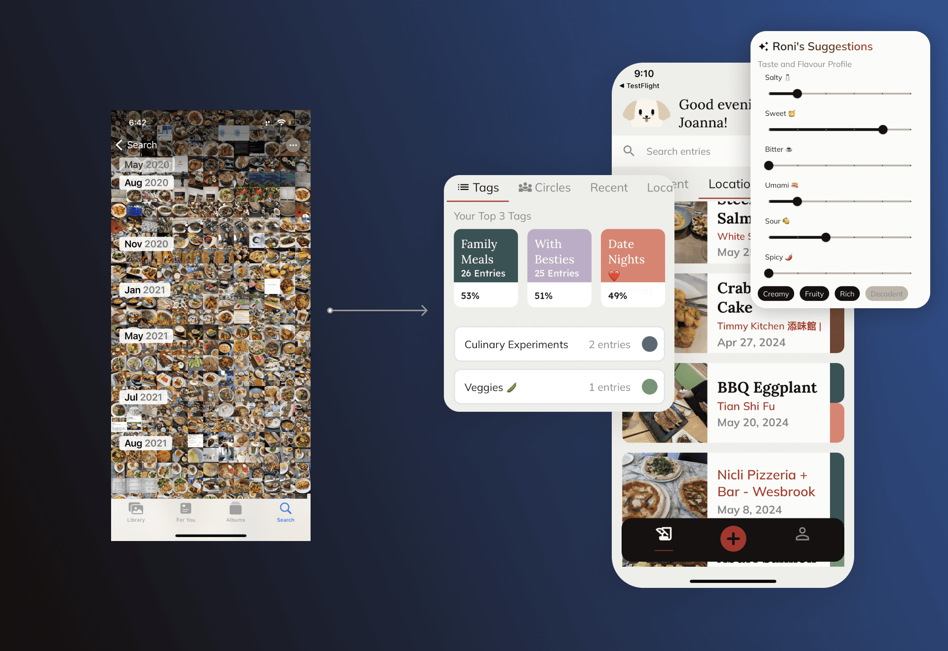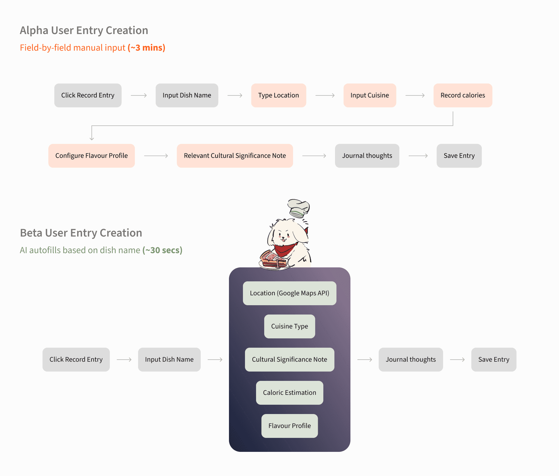 The goal behind all three was the same: automate the toil so users could focus on what actually made the meal worth logging — the memory, the people, the moment. Roni wasn't just a functional shortcut though. Giving the AI a character — a personified gourmet-dog with a name — turned a data entry task into something that felt worth returning to. No competitor in food journaling had treated the emotional layer of the experience as a design problem.