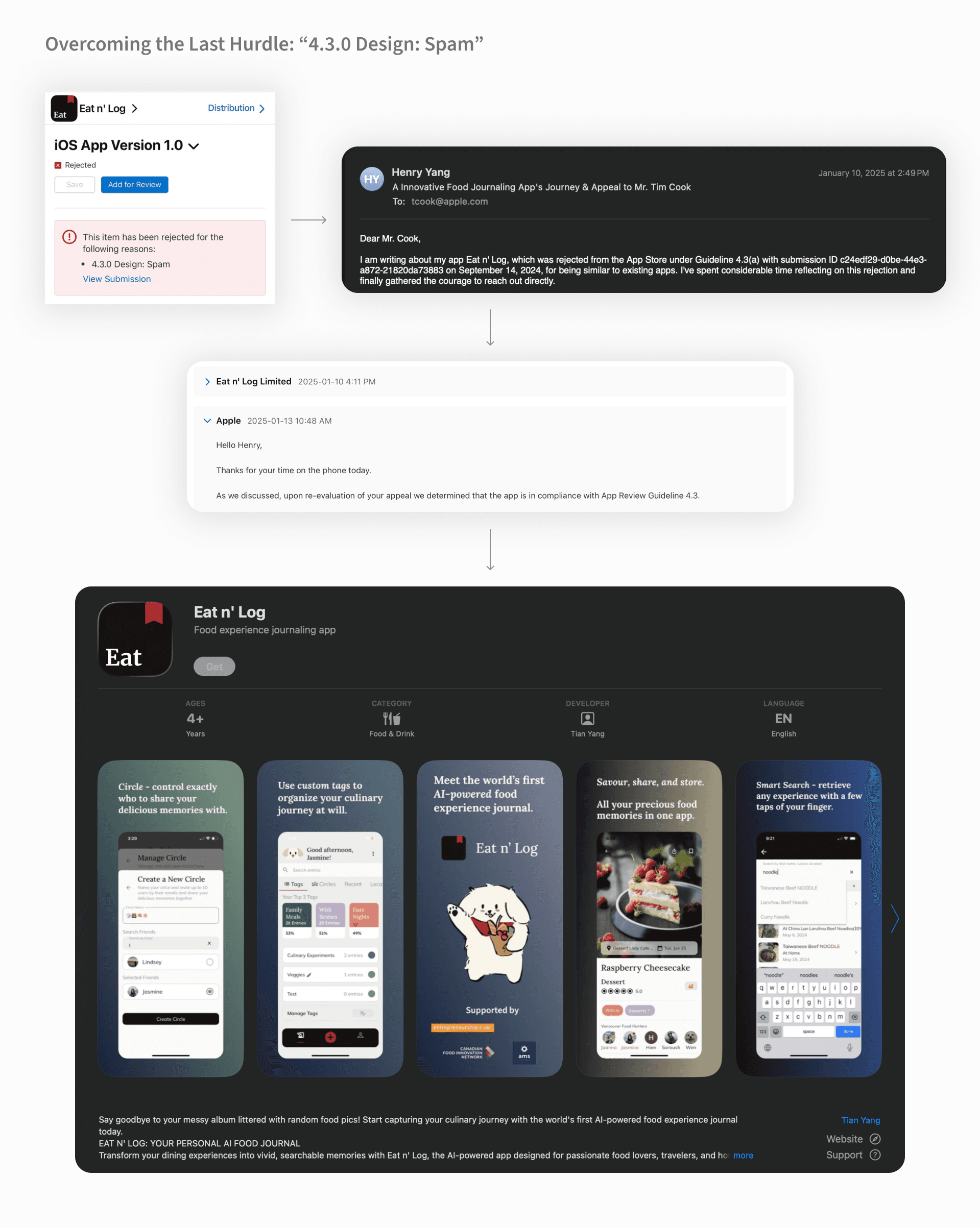 Apple rejected the app under Guideline 4.3(a) — flagged as a spam clone despite being a new category. I diagnosed it as a misclassification, found Tim Cook's office email, and wrote directly: explained the product, the category, the error.