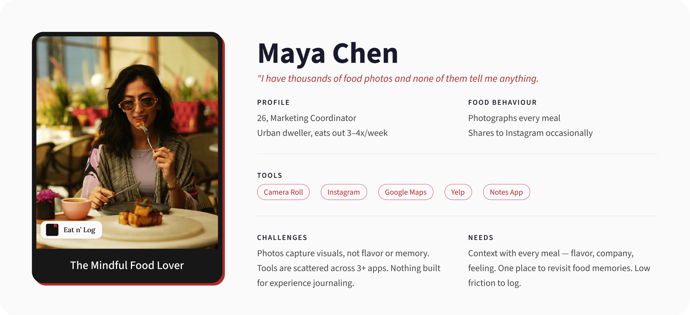 Three things came back consistently: food photos alone felt incomplete without context, people were stitching experience journaling across three or more tools, and no app existed for the category — everything was either restaurant discovery or calorie tracking.